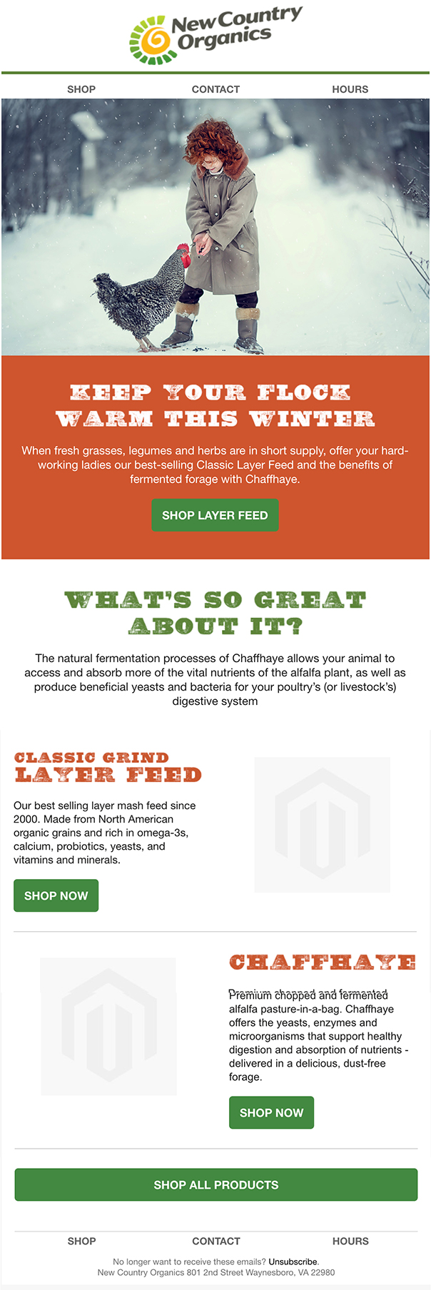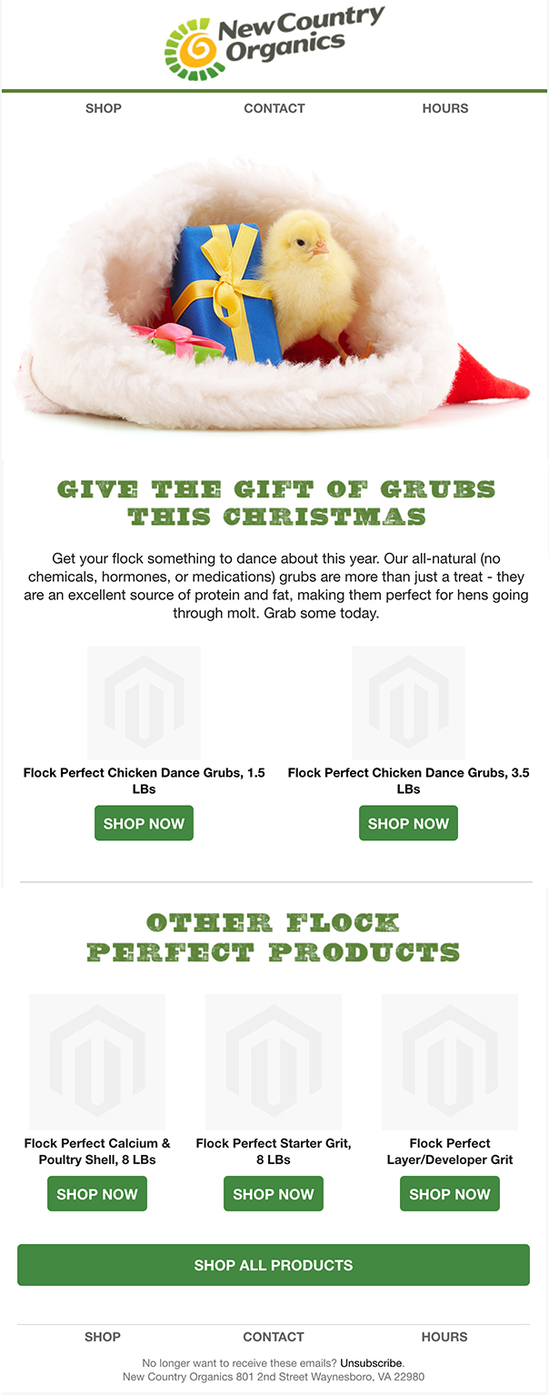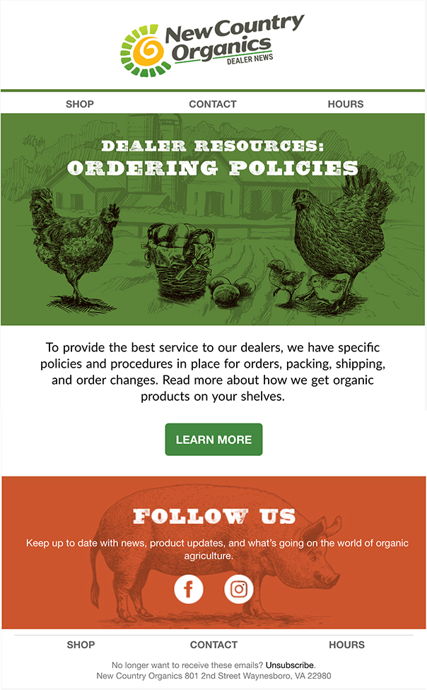 New Country Organics is an ecommerce business that sells organic animal feed and supplements. They have been trying to use their email marketing platform more efficiently and regularly for news and deals for their customers. In that process, I got to design and develop several email templates and graphics for NCO, featuring images and illustrations of cute farm animals.